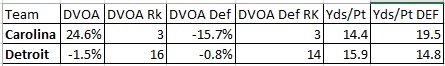 While there are metrics that favor both teams you can see below that their was a significant advantage for Carolina last year by Yards per point metric on defense and surprisingly also on offense. Getting the better team, at home at basically a pick em is too good to pass up here.