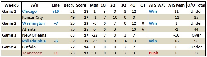 The hot streak continued into week 5, with 4 teams on Bye’s and a smaller card I found fewer games in week 5 that I liked but the ones I did were all the right side and if not for a bad a number in the Ten/Buf game it would have been a perfect 4-0. As it was, 3-0-1 was pretty good consolation so I might take a little extra time to admire this one.